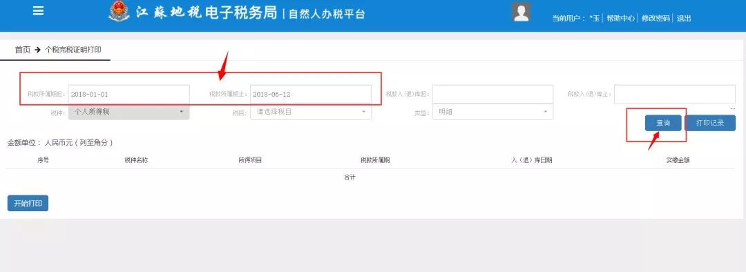 4、选择税款所属期起止,点击查询,点击左下角开始打印。